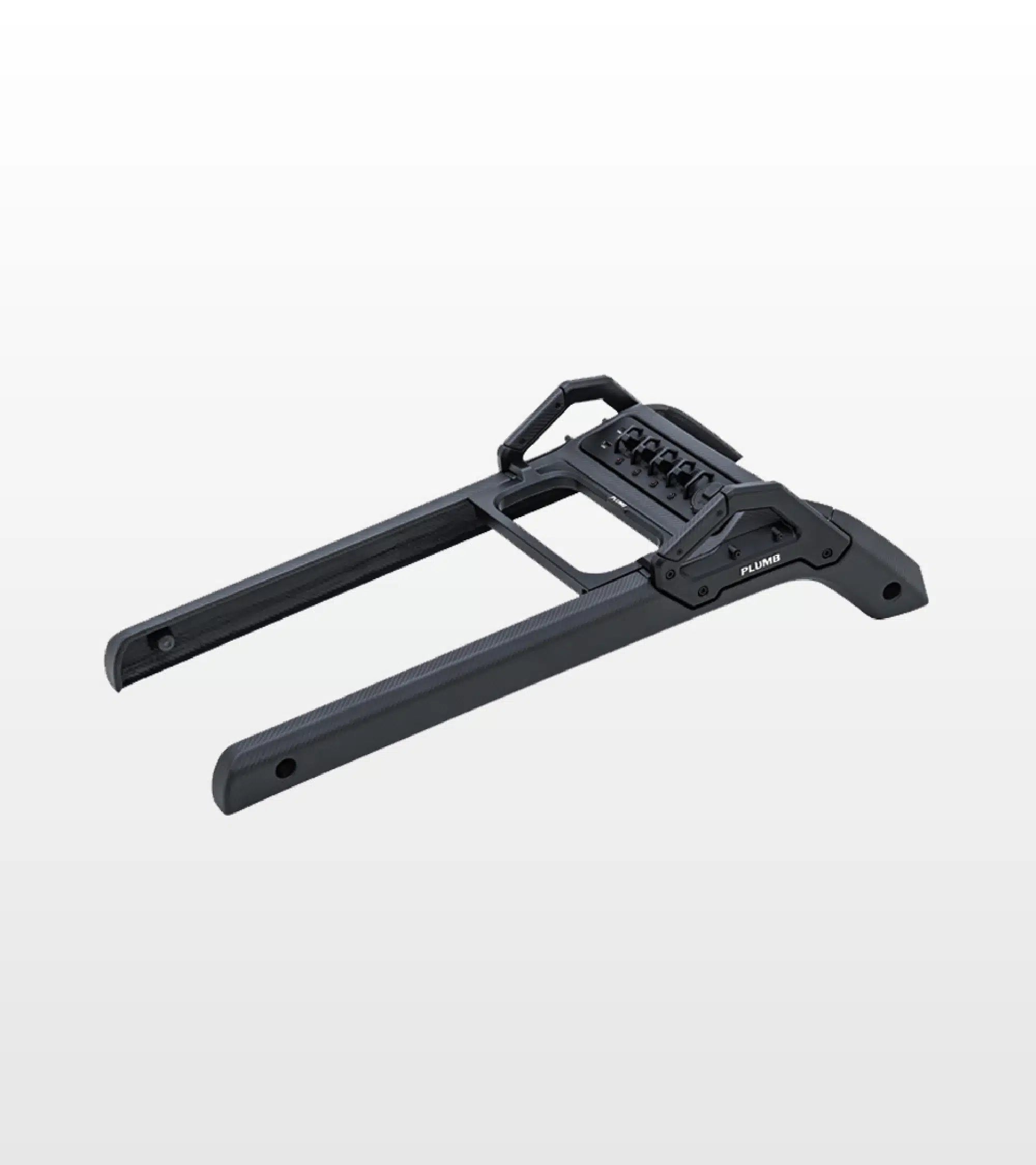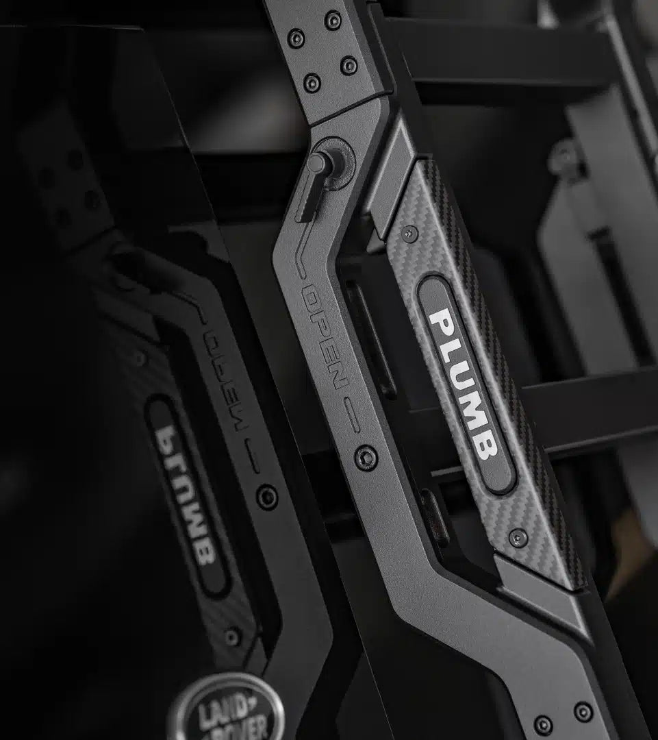The PLUMB Side Ladder for the M-one Roof Rack reduces wind noise and rearview obstruction, features a sliding rail with locking switch, and is made from aluminum magnesium alloy with carbon fiber inlay for durable, seamless integration.